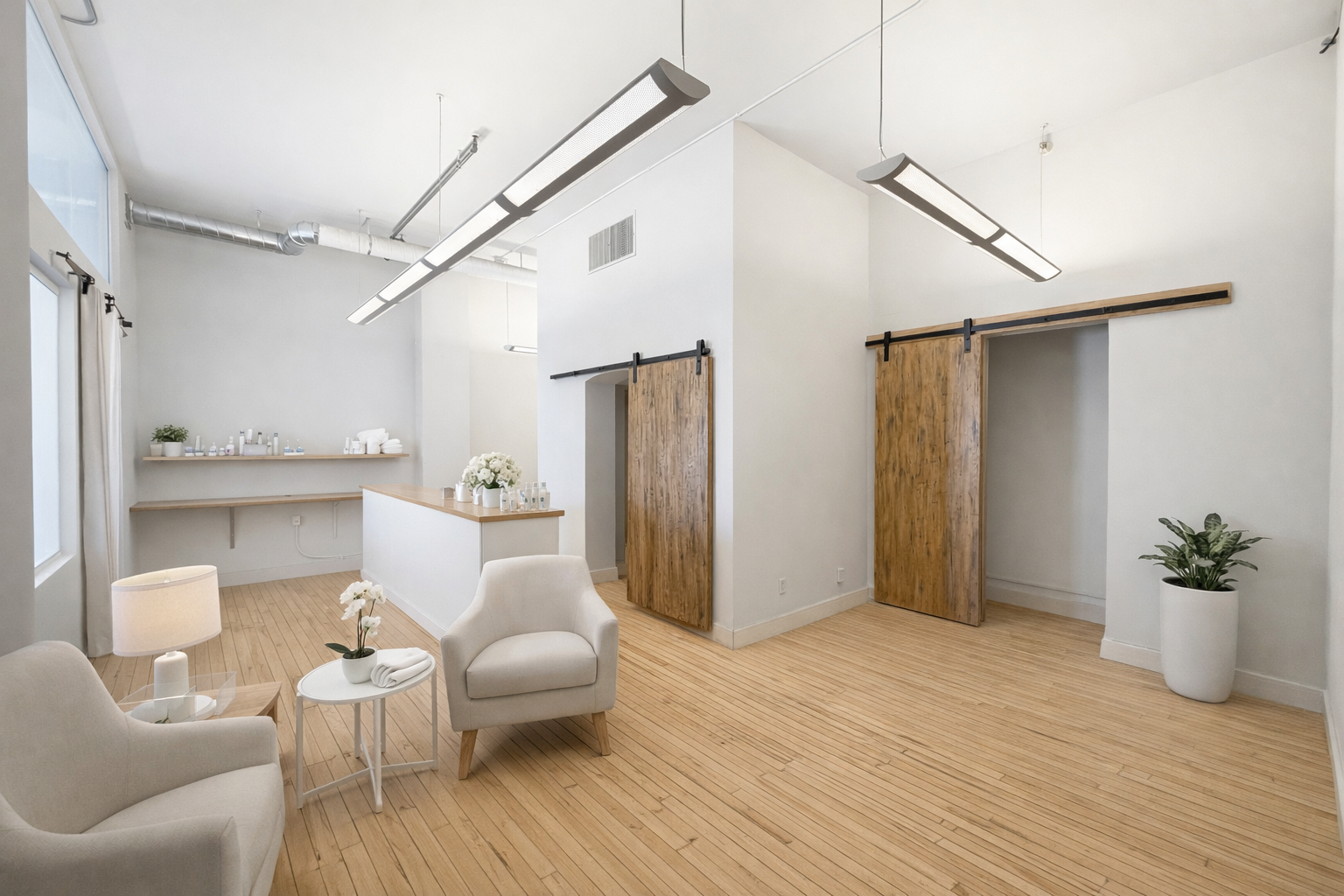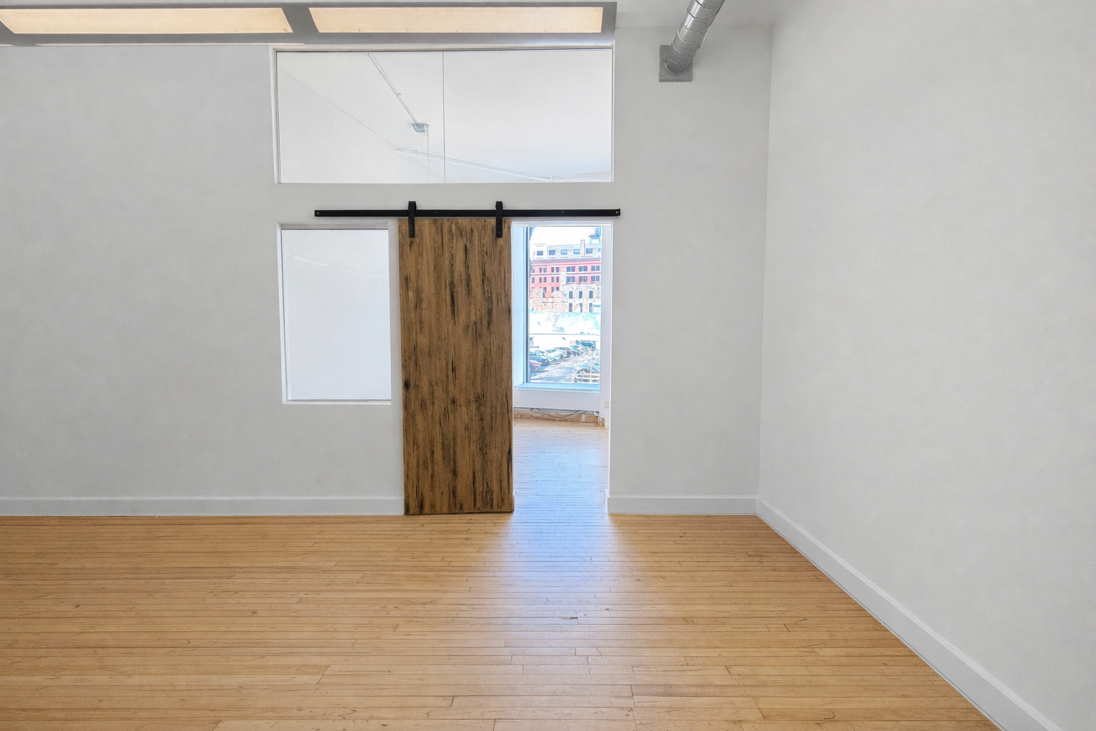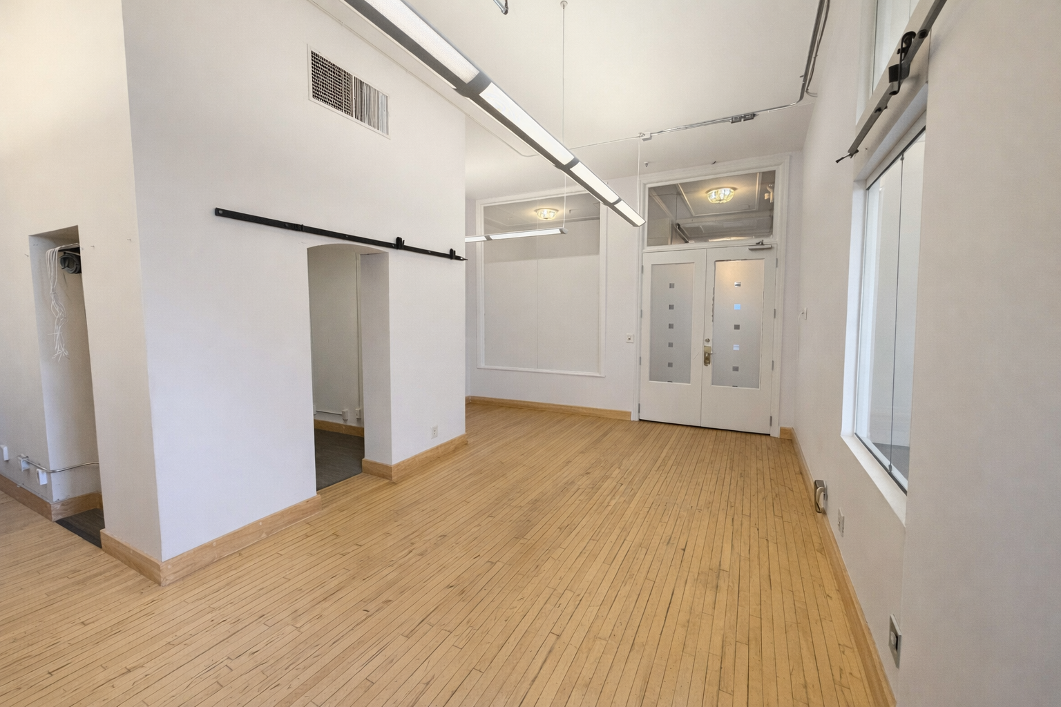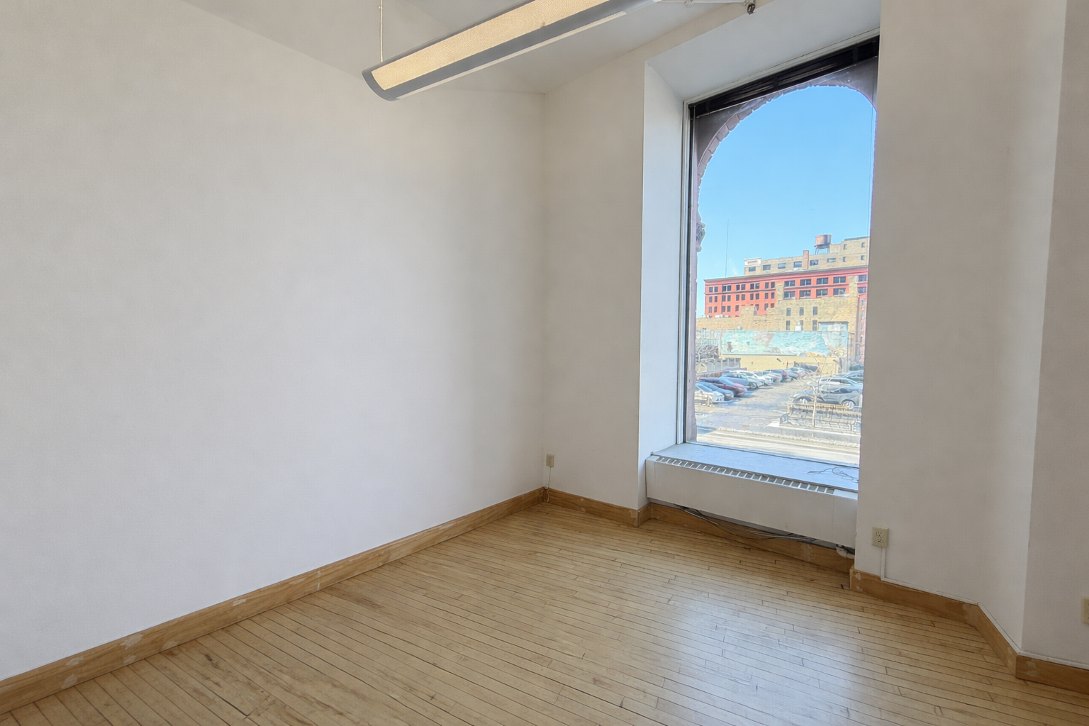Suite 105 at the historic Lumber Exchange offers 680 square feet of character-filled workspace featuring hardwood floors, high ceilings, and a private office with flexible layout options. The suite also includes convenient storage areas and a functional design suited for a variety of professional uses such as wellness, therapy, creative office, spa, etc.